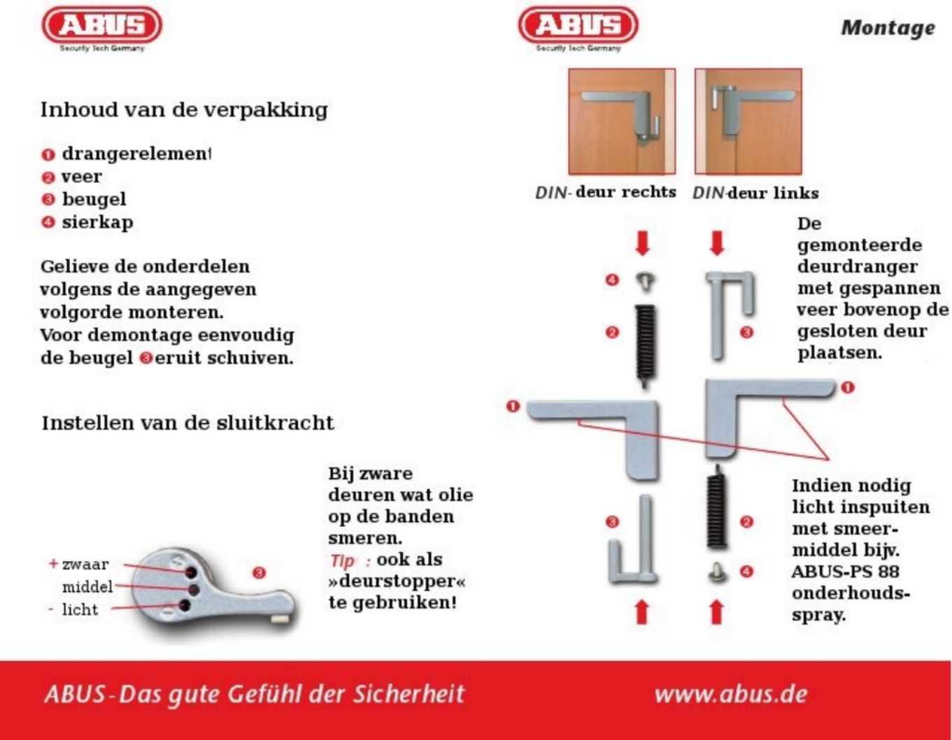 Hier is de Abus ABTS44182 (Deurdrangers) gebruikershandleiding. 2 pagina's in taal Nederlands met een gewicht van 0.5 Mb. Als u geen antwoorden op uw probleem kunt vinden Vraag het onze community.