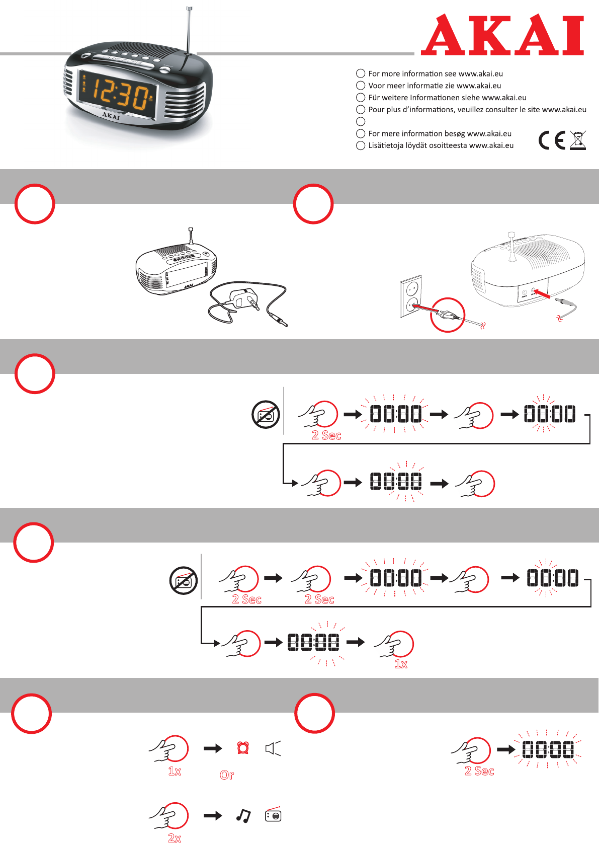 Hier is de Akai AR400 (Wekkerradio) gebruikershandleiding. 2 pagina's in taal Dansk, Deutsch, English, Français, Nederlands, Suomi, Espanõl met een gewicht van 1.3 Mb. Als u geen antwoorden op uw probleem kunt vinden Vraag het onze community.