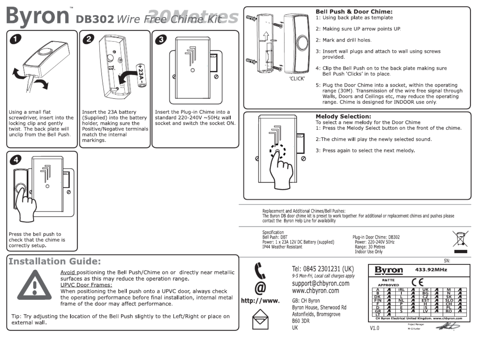 Hier is de Byron DB302 (Deurbel) gebruikershandleiding. 1 pagina's in taal English met een gewicht van 0.2 Mb. Als u geen antwoorden op uw probleem kunt vinden Vraag het onze community.