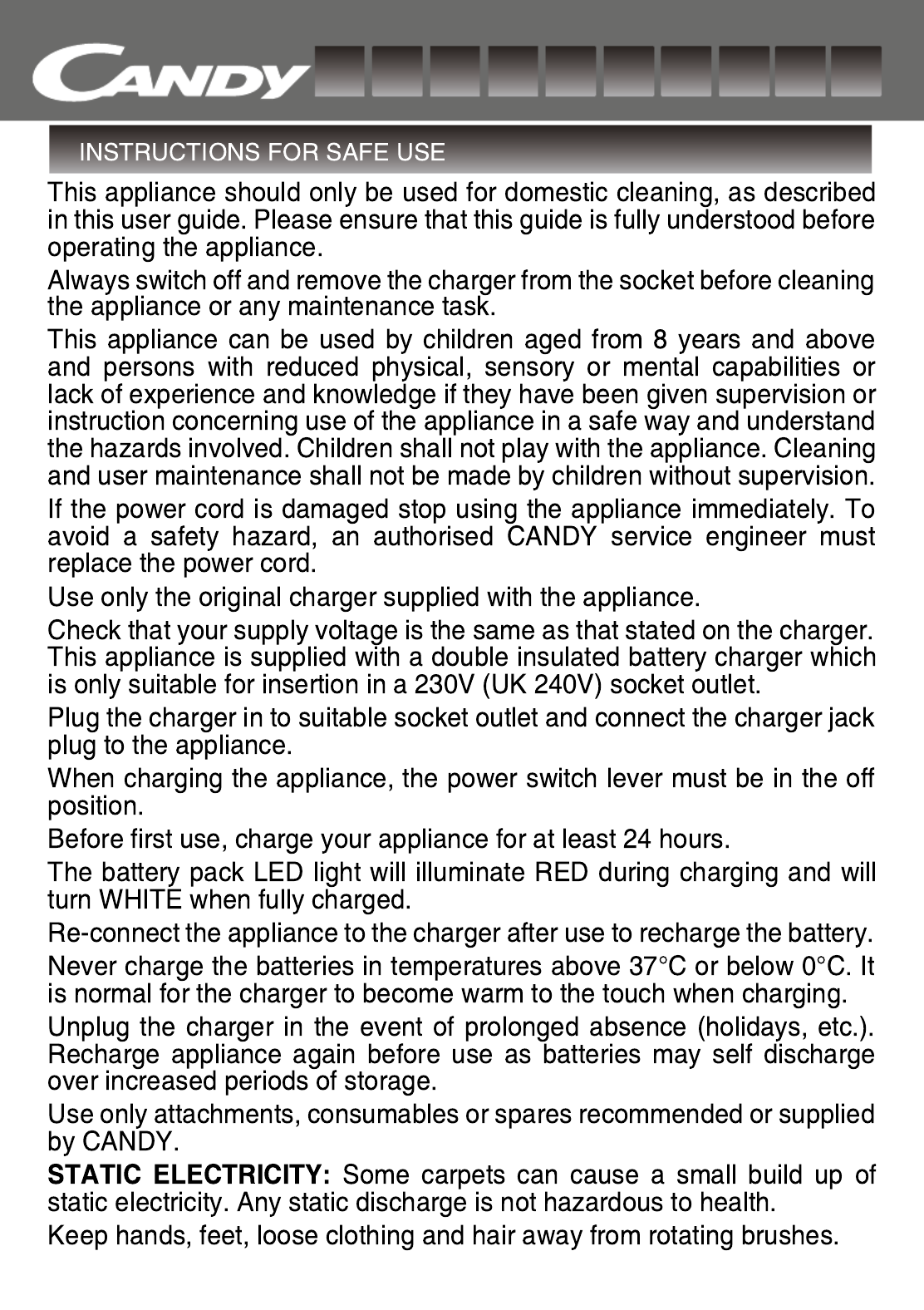 Hier is de Candy CVIVA15 011 (Stofzuiger) gebruikershandleiding. 20 pagina's in taal Engels met een gewicht van 1.1 Mb. Als u geen antwoorden op uw probleem kunt vinden Vraag het onze community.