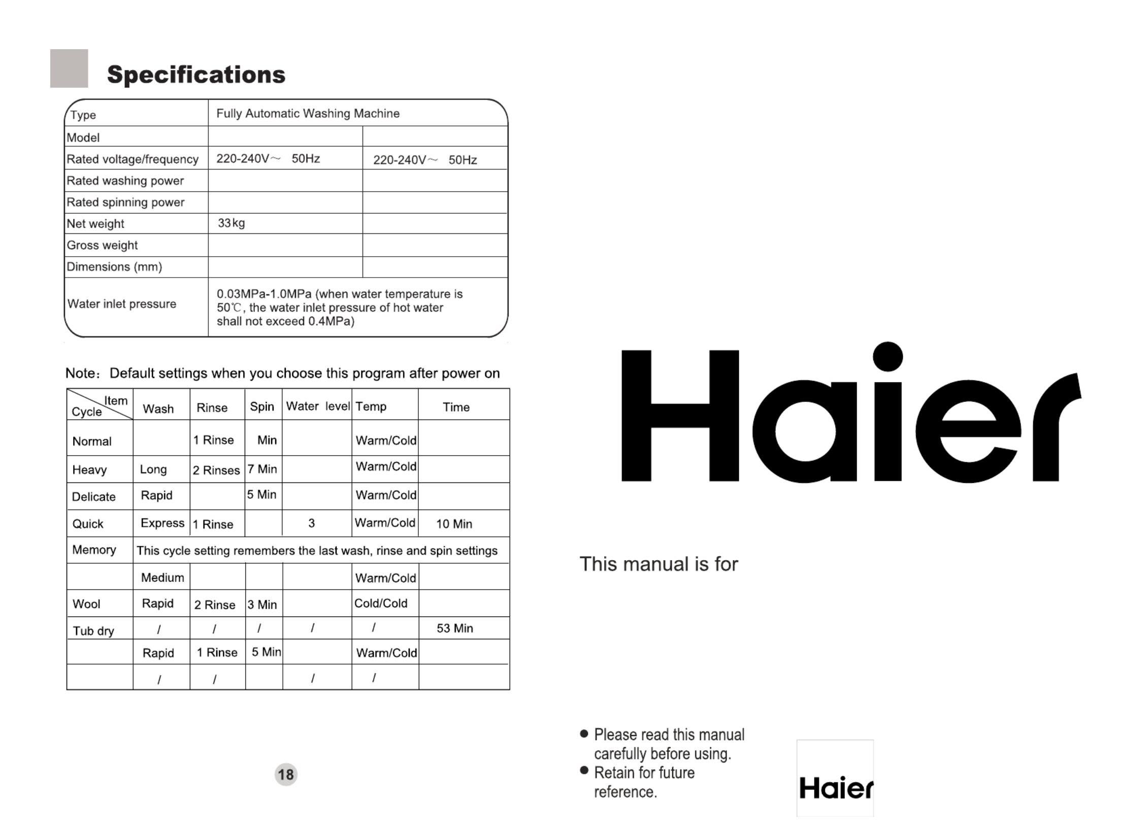 Hier is de Haier HWMSP70 (Wasmachines) gebruikershandleiding. 10 pagina's in taal Engels met een gewicht van 1.9 Mb. Als u geen antwoorden op uw probleem kunt vinden Vraag het onze community.