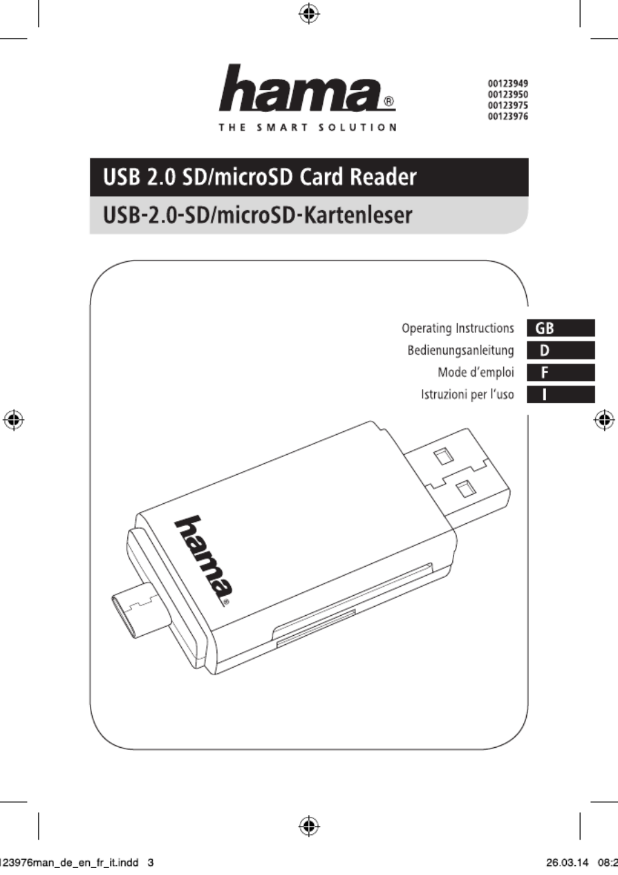 Hier is de Hama 00123976 (Geheugenkaartlezer) gebruikershandleiding. 13 pagina's in taal Engels met een gewicht van 0.8 Mb. Als u geen antwoorden op uw probleem kunt vinden Vraag het onze community.