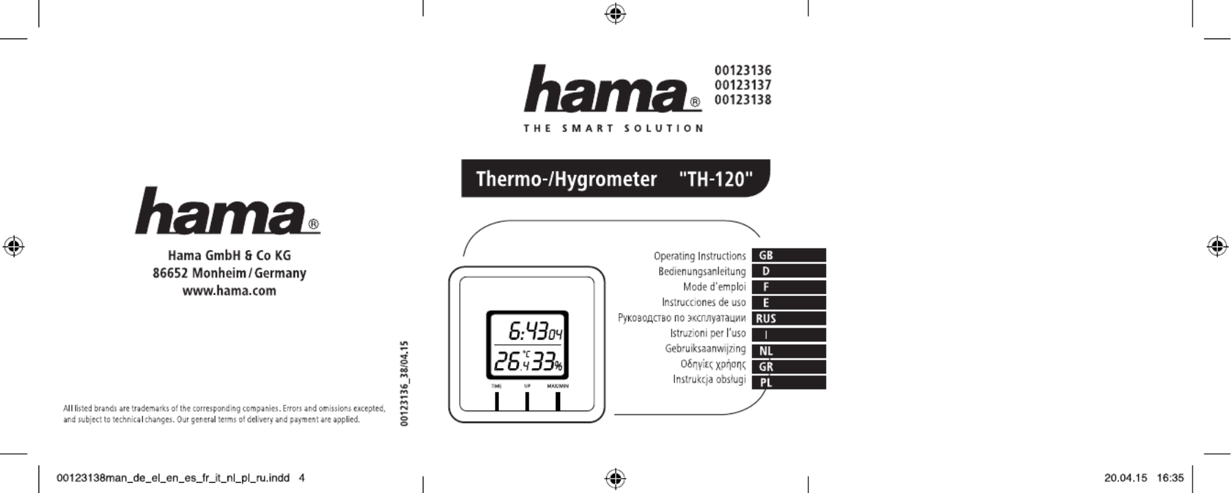 Hier is de Hama TH-120 (Weerstation) gebruikershandleiding. 33 pagina's in taal - met een gewicht van 1.9 Mb. Als u geen antwoorden op uw probleem kunt vinden Vraag het onze community.