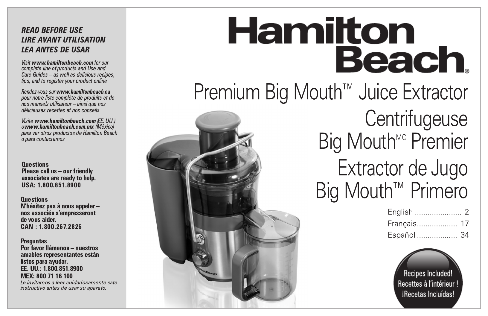 Hier is de Hamilton Beach Premium Big Mouth 67850 (Sapcentrifuge) gebruikershandleiding. 52 pagina's in taal Engels met een gewicht van 2.1 Mb. Als u geen antwoorden op uw probleem kunt vinden Vraag het onze community.