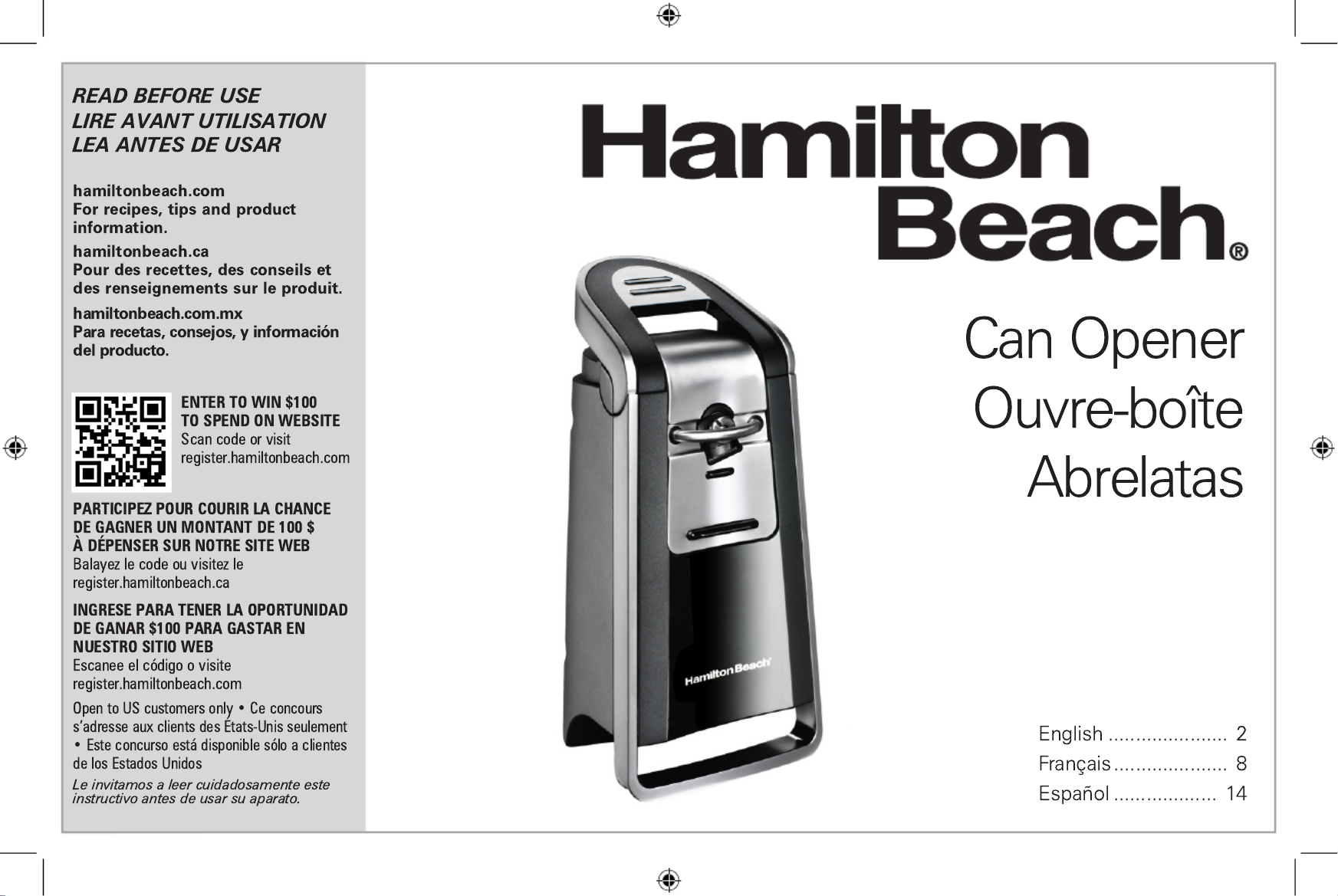 Hier is de Hamilton Beach SmoothTouch 76606 (Blikopener) gebruikershandleiding. 20 pagina's in taal Engels met een gewicht van 1.9 Mb. Als u geen antwoorden op uw probleem kunt vinden Vraag het onze community.