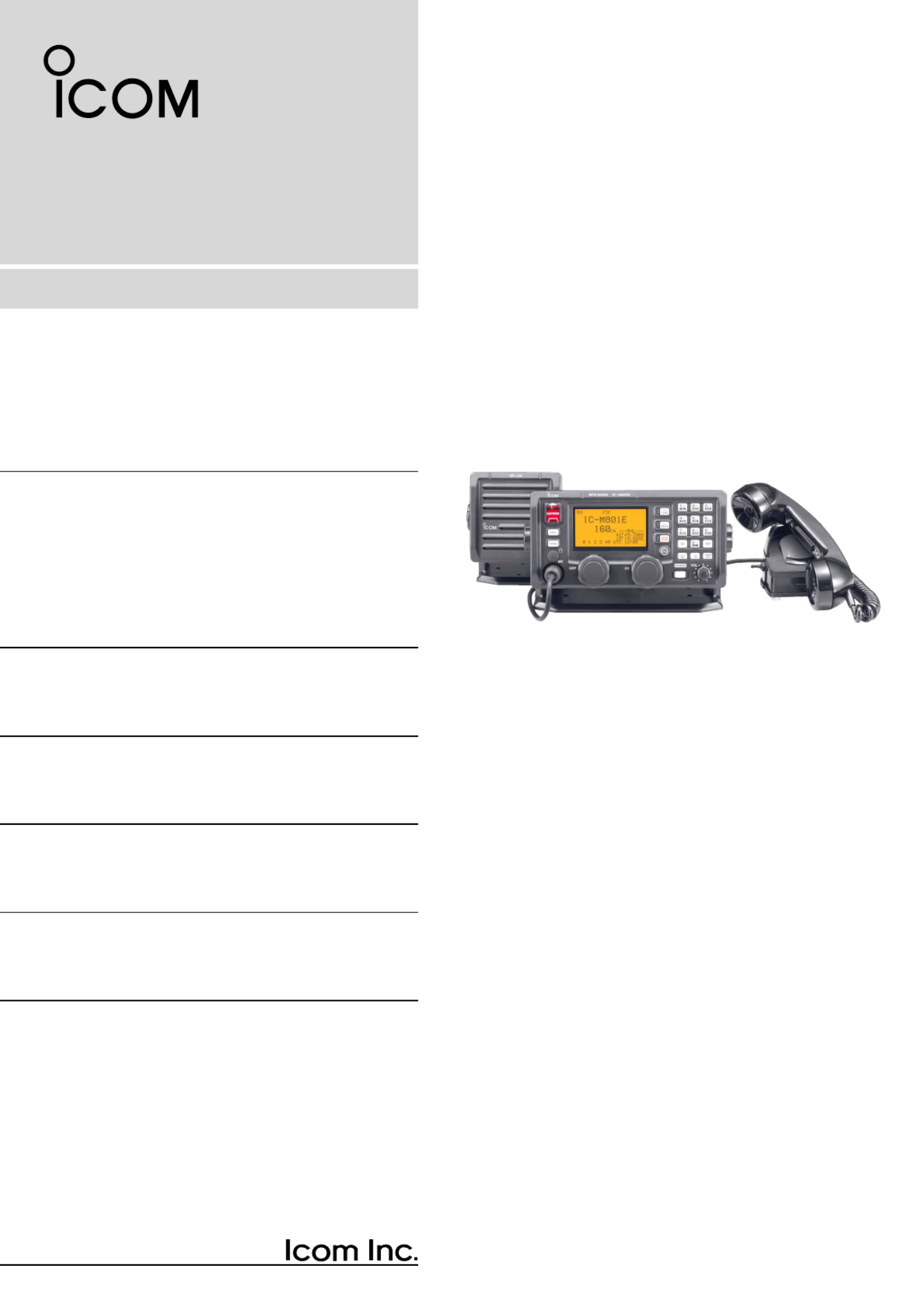 Hier is de Icom IC-M801E (Receiver) gebruikershandleiding. 80 pagina's in taal Engels met een gewicht van 3.6 Mb. Als u geen antwoorden op uw probleem kunt vinden Vraag het onze community.