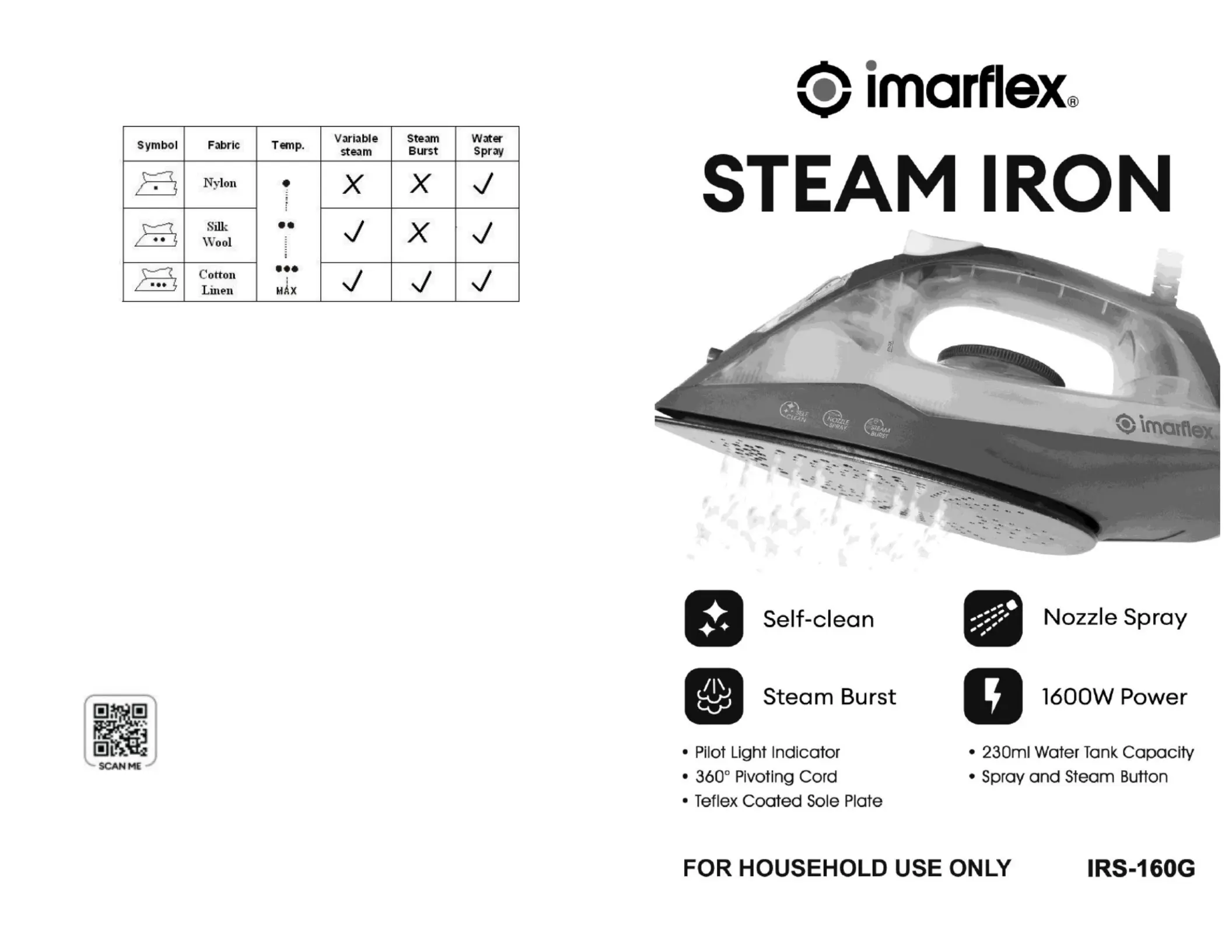 Hier is de Imarflex IRS-160G (Strijkijzer) gebruikershandleiding. 2 pagina's in taal met een gewicht van 982,441.0 Mb. Als u geen antwoorden op uw probleem kunt vinden Vraag het onze community.