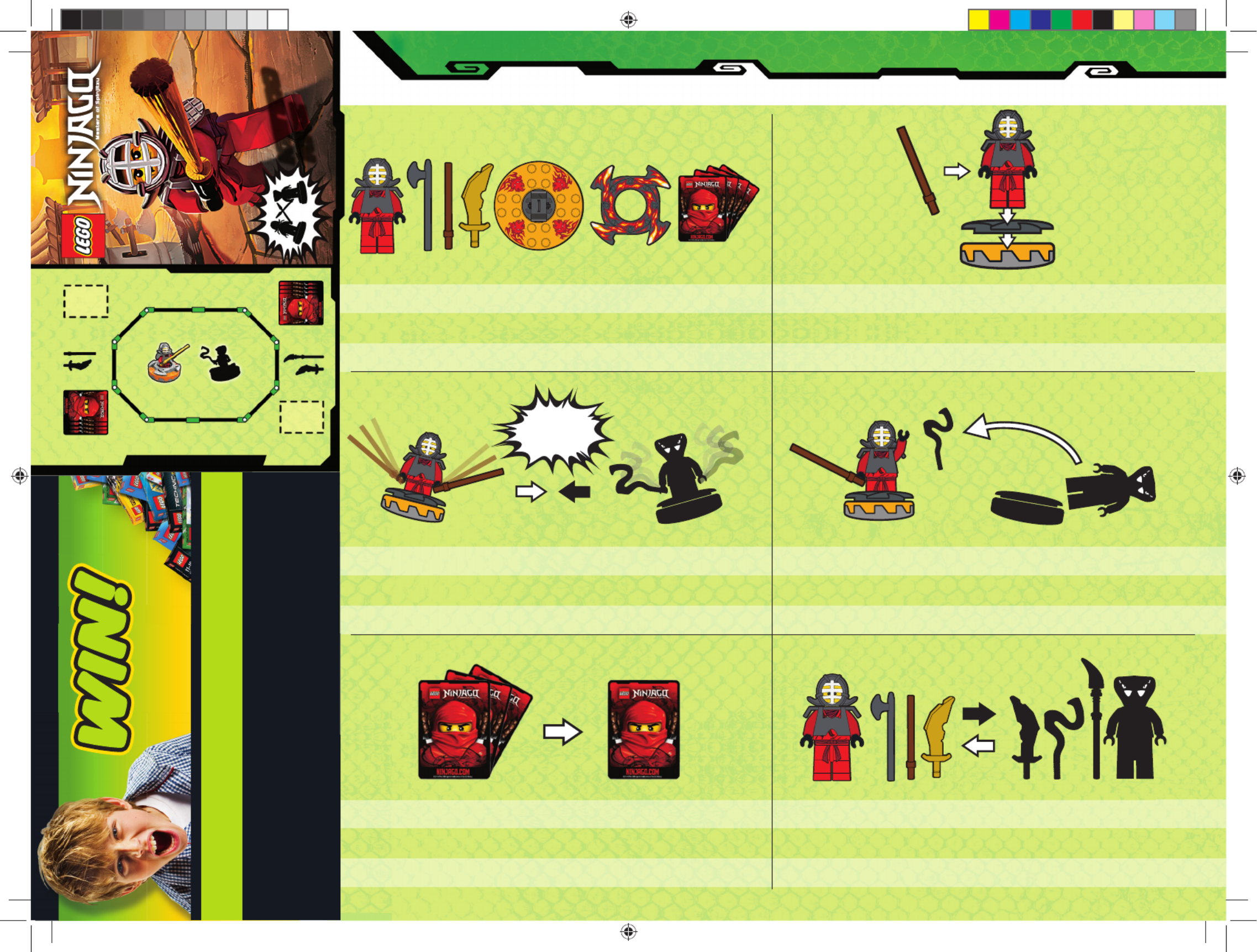 Choose a Ninjago character, three weapons, a spinner, a crown and four battle cards. Put a weapon in your character’s hand, build the crown onto the spinner, and place