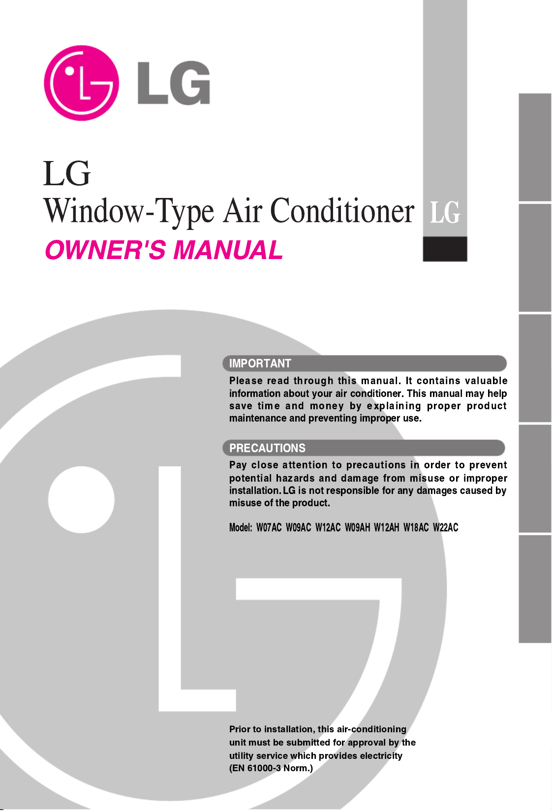 Hier is de LG AWC096GGAA0 (Airconditioners) gebruikershandleiding. 104 pagina's in taal met een gewicht van 4.9 Mb. Als u geen antwoorden op uw probleem kunt vinden Vraag het onze community.