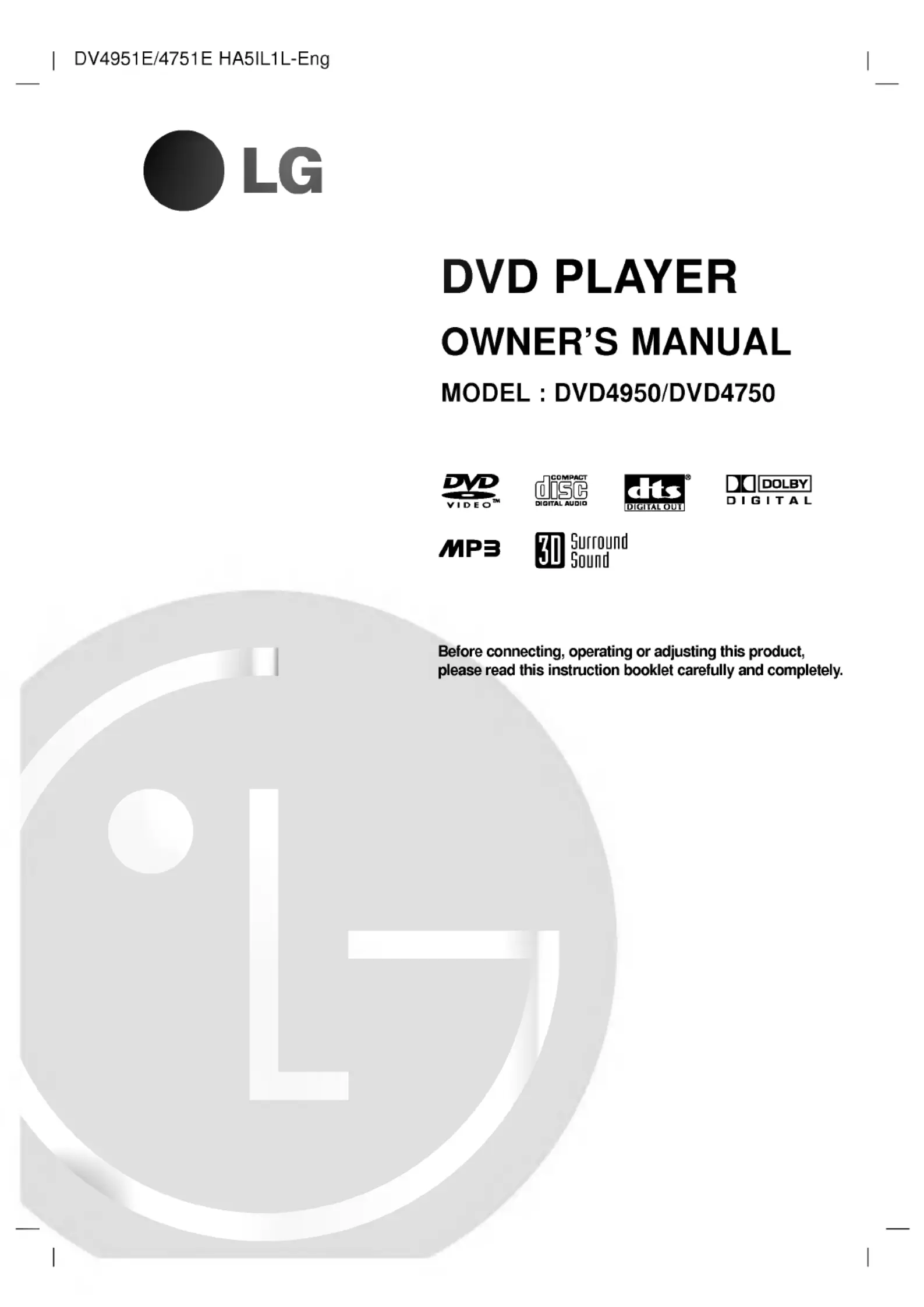 Hier is de LG DVD4750 (DVD speler) gebruikershandleiding. 44 pagina's in taal Engels met een gewicht van 8,650,380.0 Mb. Als u geen antwoorden op uw probleem kunt vinden Vraag het onze community.