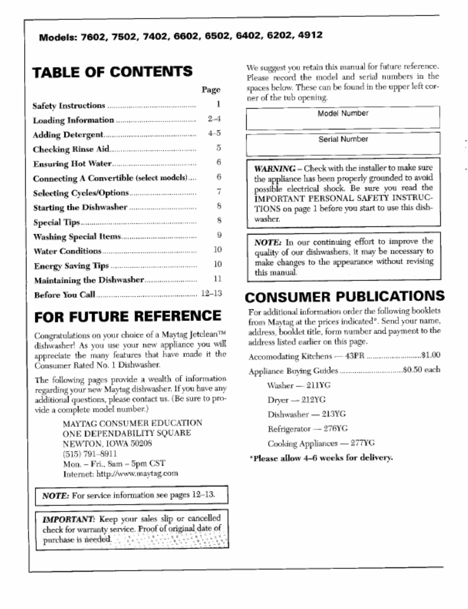 Selecting Cycles Optlons ................................ 7 possible electrical shock. Be sure you read the/ IMPORTANT PERSONAL SAFETY INSTRUC-