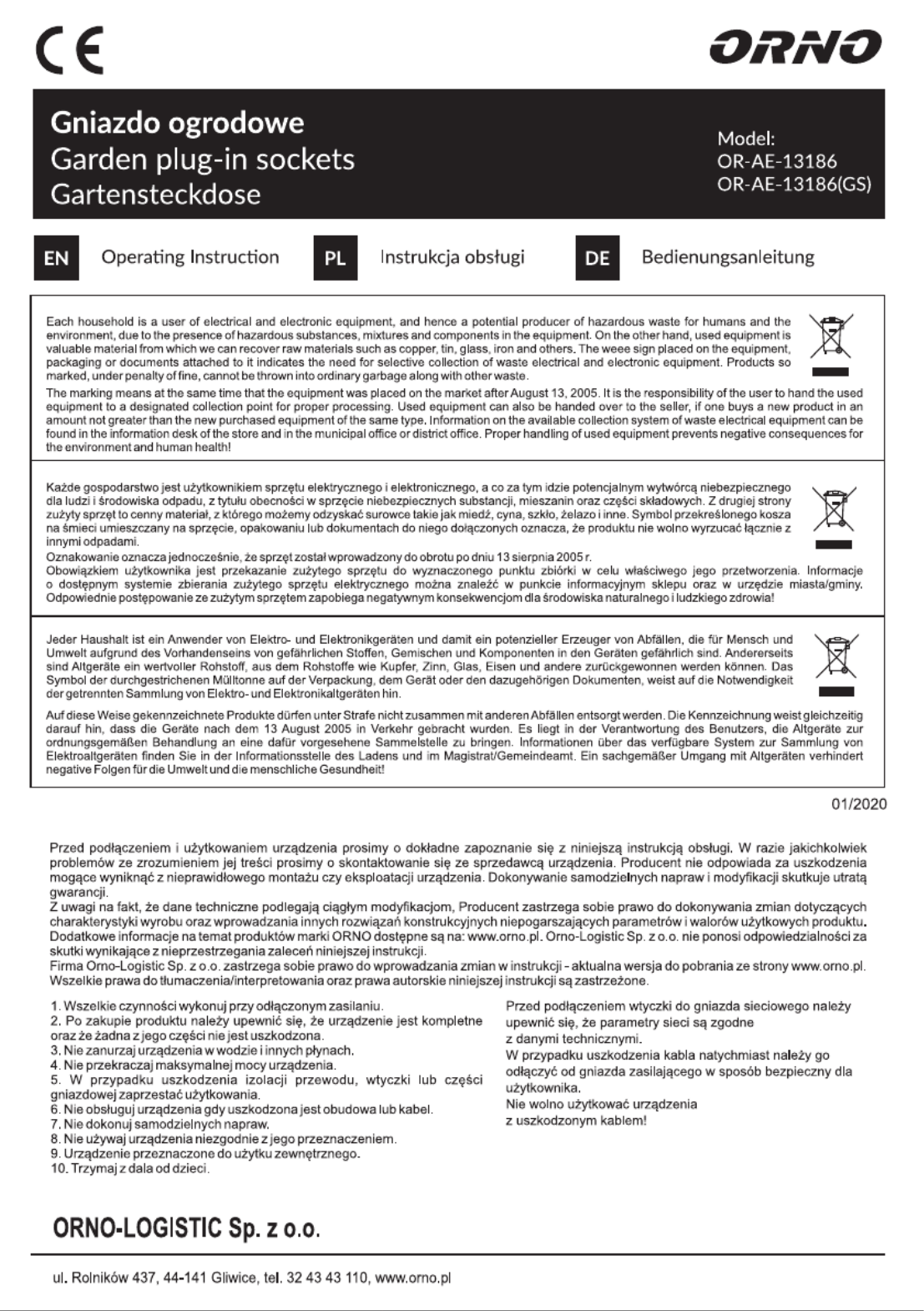 Hier is de ORNO OR-AE-13186 (Stopcontact) gebruikershandleiding. 4 pagina's in taal Engels met een gewicht van 0.5 Mb. Als u geen antwoorden op uw probleem kunt vinden Vraag het onze community.