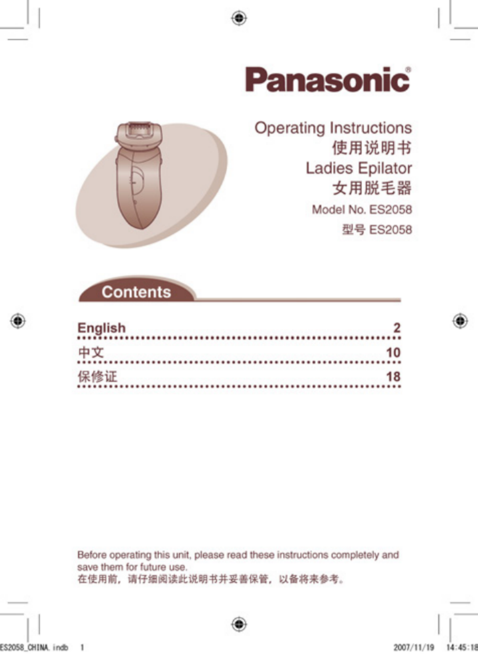 Hier is de Panasonic ES-2056 (Epilator) gebruikershandleiding. 20 pagina's in taal - met een gewicht van 0.6 Mb. Als u geen antwoorden op uw probleem kunt vinden Vraag het onze community.