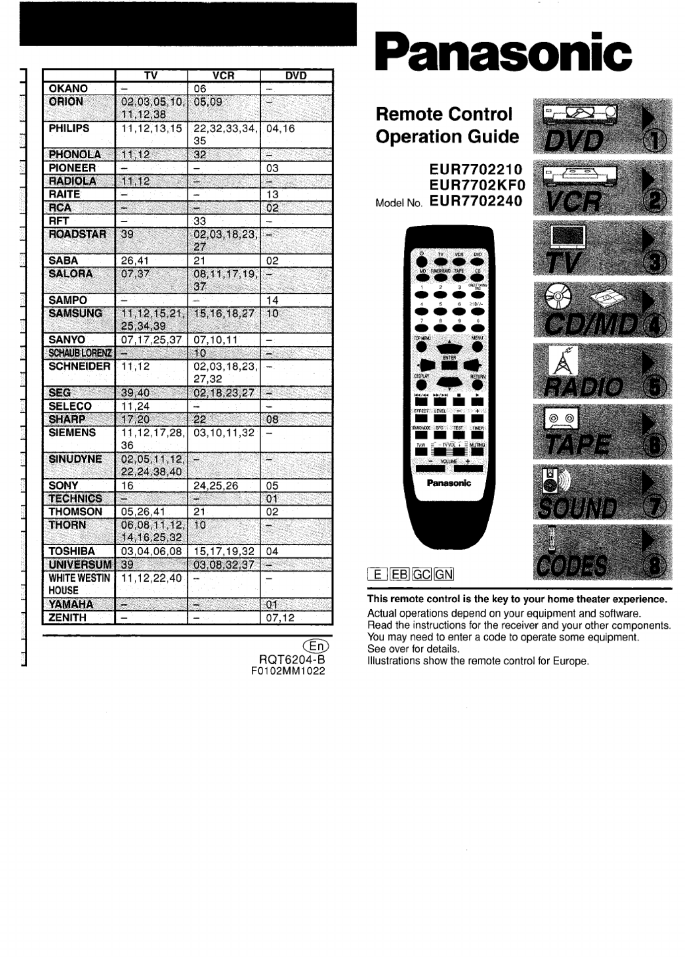 Hier is de Panasonic EUR7702210 (Afstandsbediening) gebruikershandleiding. 6 pagina's in taal - met een gewicht van 1.2 Mb. Als u geen antwoorden op uw probleem kunt vinden Vraag het onze community.