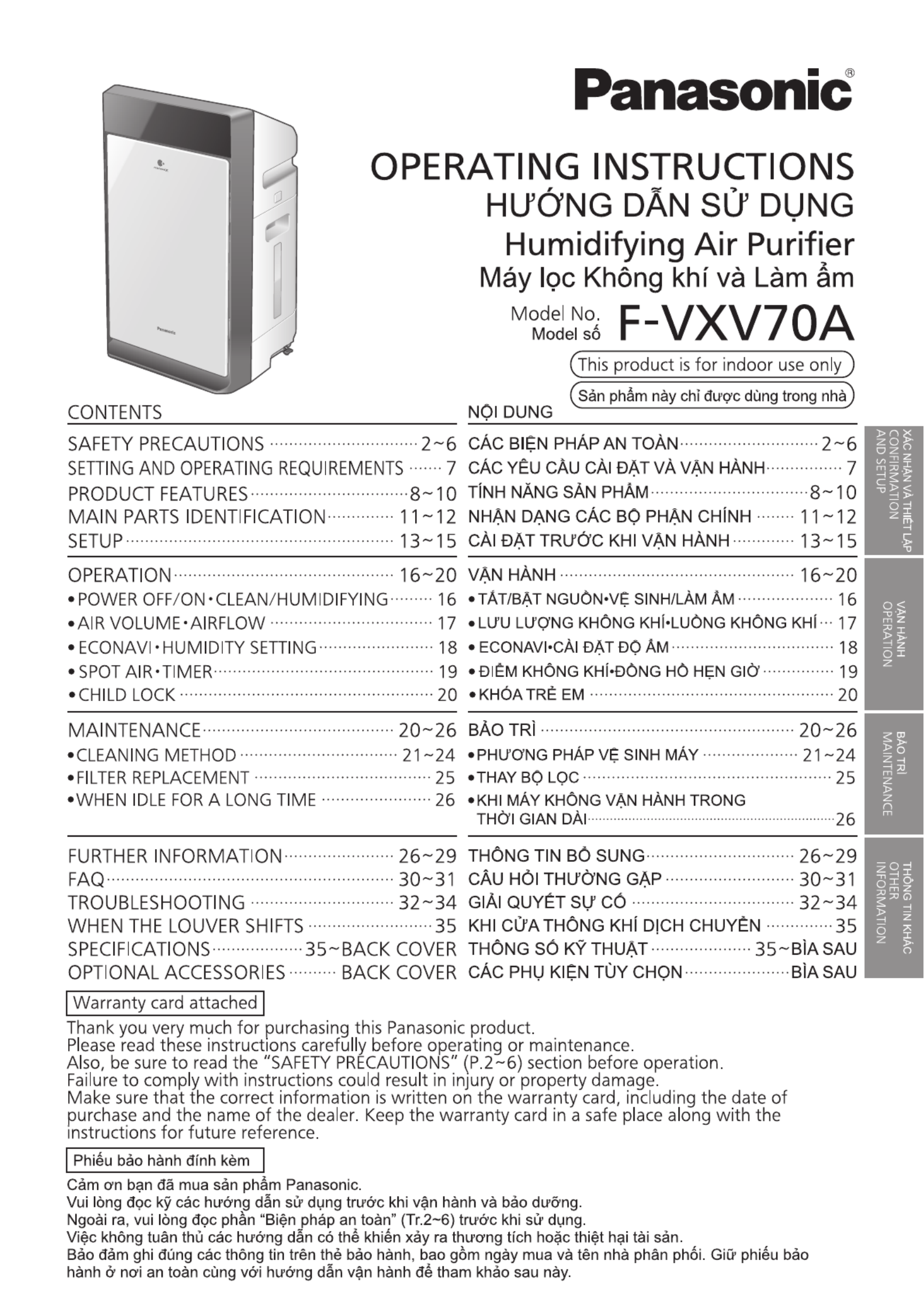 Hier is de Panasonic F-VXV70A (Luchtreiniger) gebruikershandleiding. 36 pagina's in taal Engels met een gewicht van 9.3 Mb. Als u geen antwoorden op uw probleem kunt vinden Vraag het onze community.