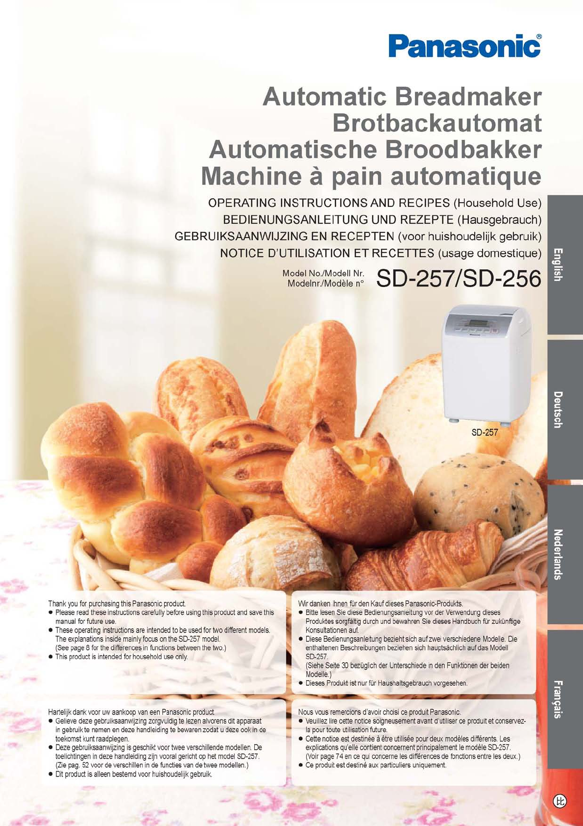 Hier is de Panasonic SD-256 Broodbakmachine (Broodbakmachine) gebruikershandleiding. 94 pagina's in taal Deutsch, English, Français, Nederlands met een gewicht van 6.2 Mb. Als u geen antwoorden op uw probleem kunt vinden Vraag het onze community.