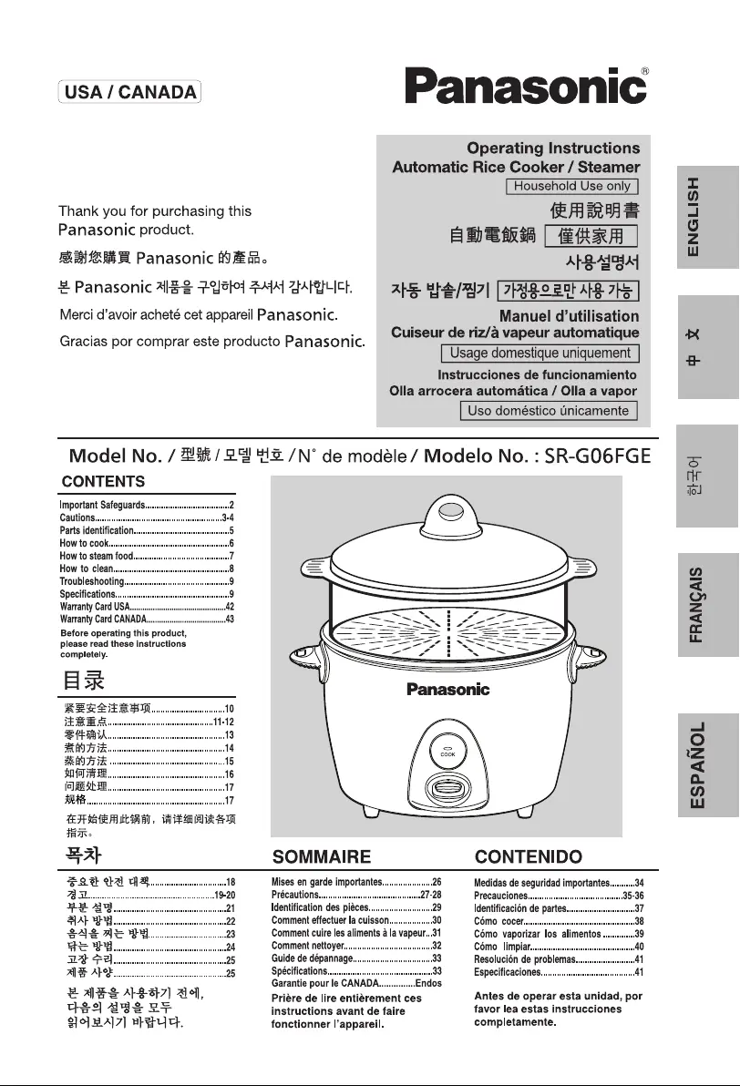 Hier is de Panasonic SR-G06FGE (Rijstkoker) gebruikershandleiding. 44 pagina's in taal met een gewicht van 4,330,290.0 Mb. Als u geen antwoorden op uw probleem kunt vinden Vraag het onze community.