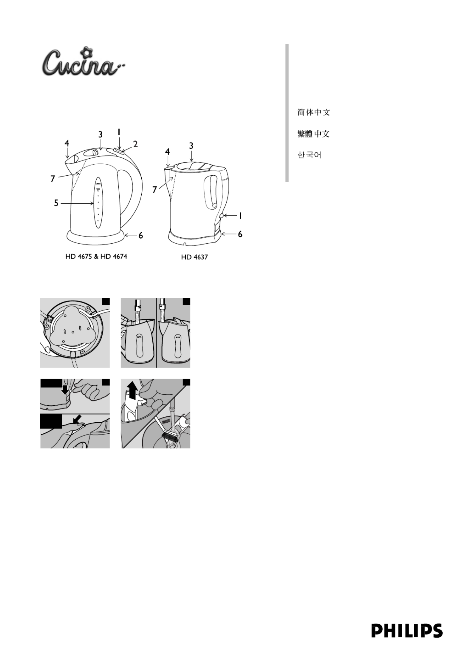Hier is de Philips Cucina HD4674 (Waterkoker) gebruikershandleiding. 8 pagina's in taal Engels met een gewicht van 1.2 Mb. Als u geen antwoorden op uw probleem kunt vinden Vraag het onze community.