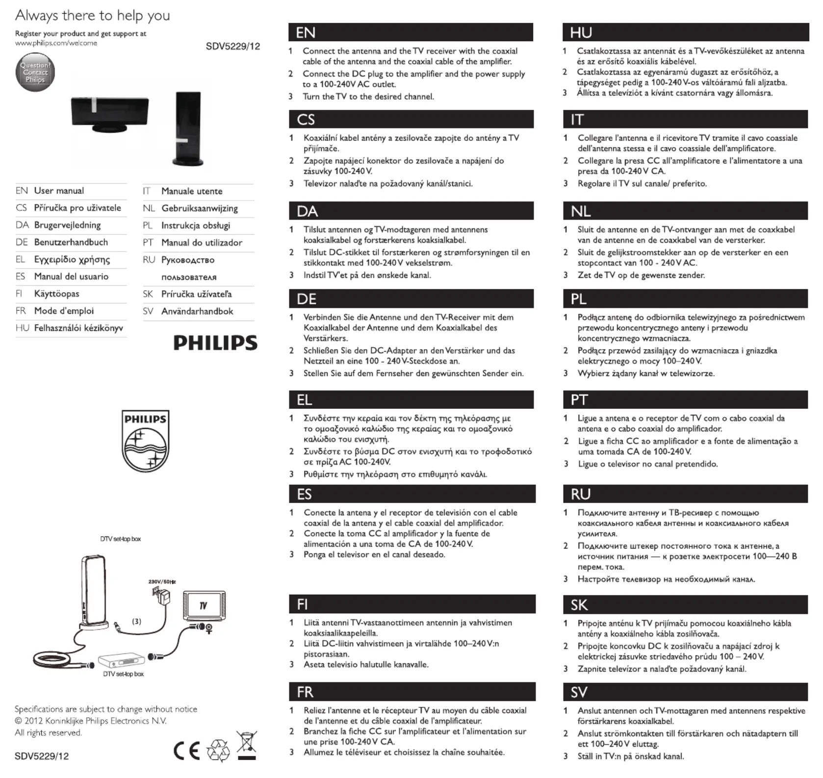 Hier is de Philips SDV5229 (Tv-antenne) gebruikershandleiding. 1 pagina's in taal met een gewicht van 228,092.0 Mb. Als u geen antwoorden op uw probleem kunt vinden Vraag het onze community.
