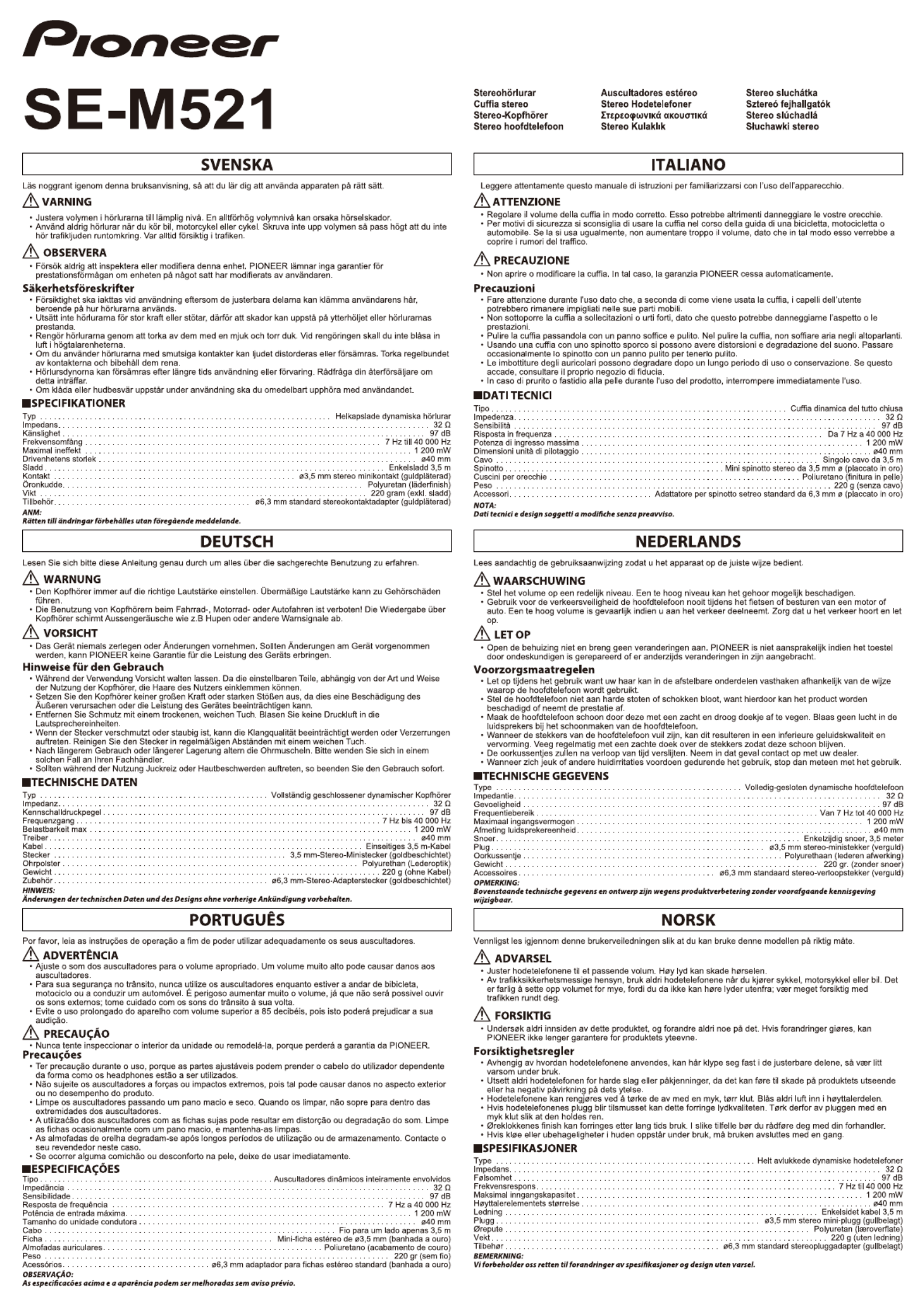Hier is de Pioneer SE-M521 (Hoofdtelefoon) gebruikershandleiding. 2 pagina's in taal Nederlands met een gewicht van 0.7 Mb. Als u geen antwoorden op uw probleem kunt vinden Vraag het onze community.