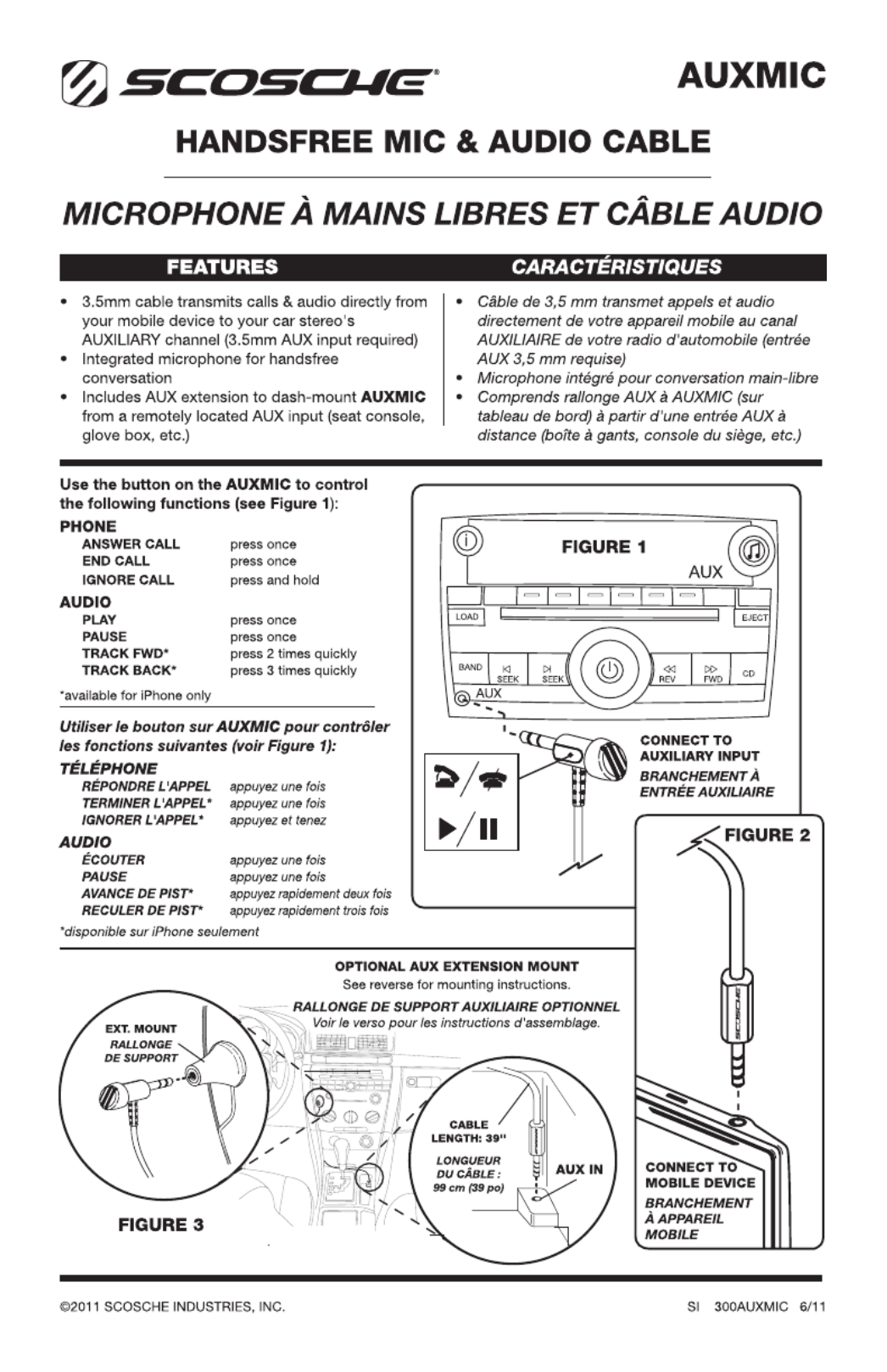 Hier is de Scosche auxMIC (Carkit) gebruikershandleiding. 2 pagina's in taal Engels met een gewicht van 0.1 Mb. Als u geen antwoorden op uw probleem kunt vinden Vraag het onze community.