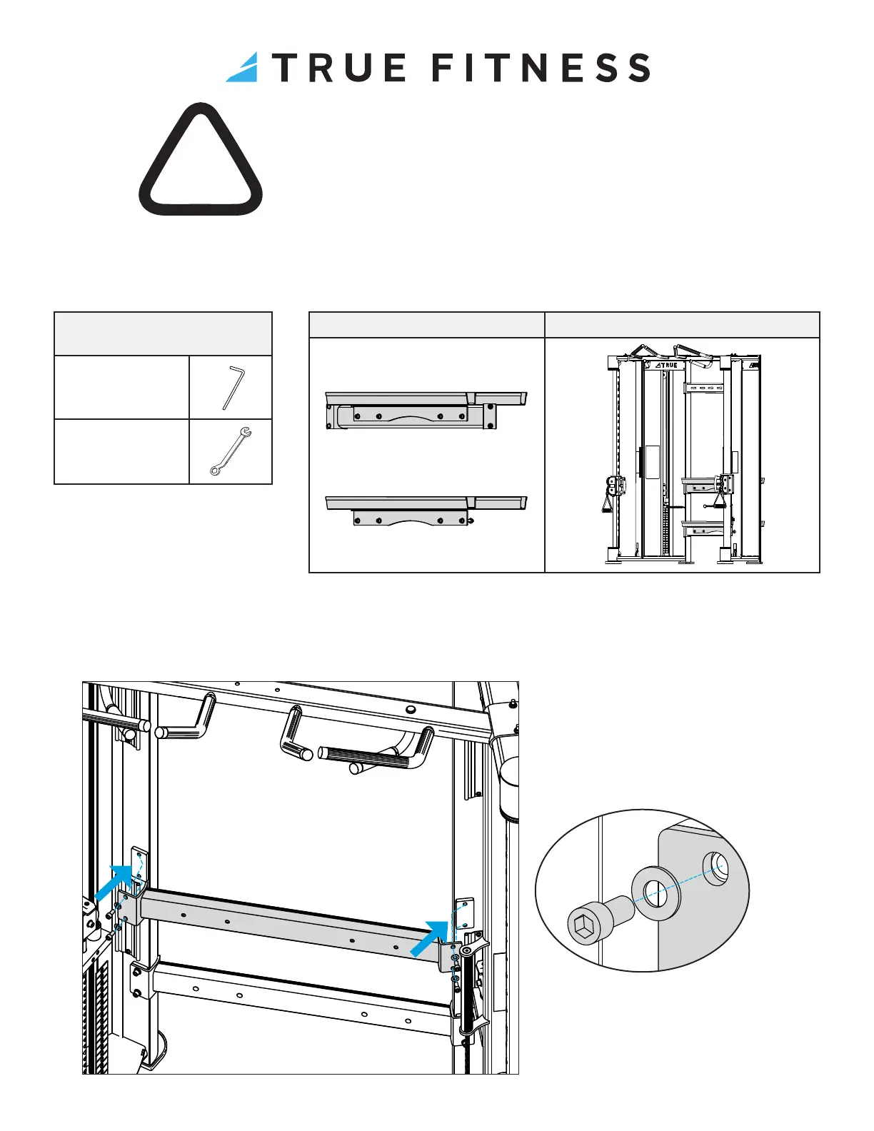 1. Using a 5/16” allen wrench, attach the upper connecting frame cross bar with 4 socket head cap screws and 4 at washers